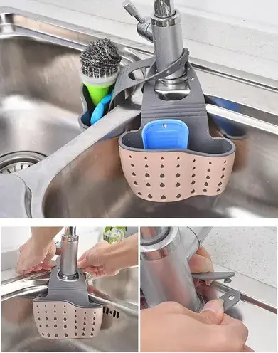 Mantiene la esponja y accesorios siempre secos. +Ahorra espacio en la cocina.